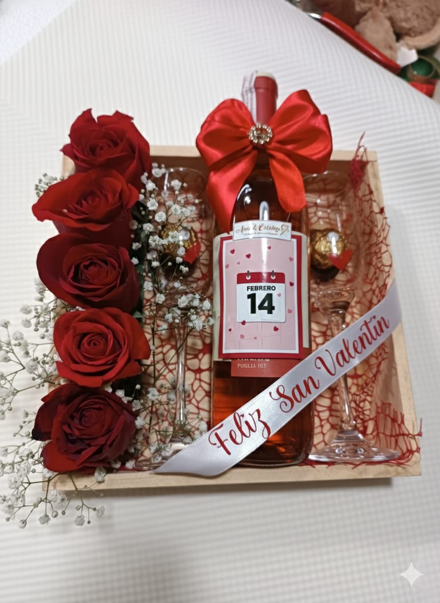 La "Caja con Vino" es la respuesta que necesitas. Incluye una exquisita botella de vino, dos elegantes copas, dos chocolates Ferrero y cinco rosas, todo presentado en una hermosa caja de madera de pino. Regala una experiencia que envuelva a esa persona especial en ternura y conexión. 🍷🌹✨